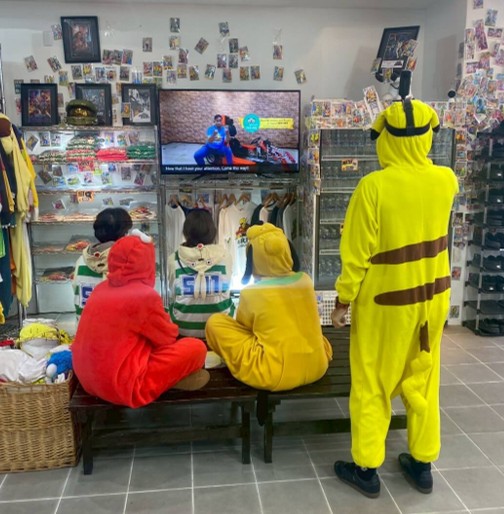 接著就是從掛滿滿一排的趣味Cosplay服裝中,挑選一件自己喜歡的換上,這樣駕駛卡丁車會更吸睛有趣。一開始我選了福音戰士初號機的服裝,但換穿後實在太中二,我還是選個簡單素色又亮眼的皮卡丘裝吧。