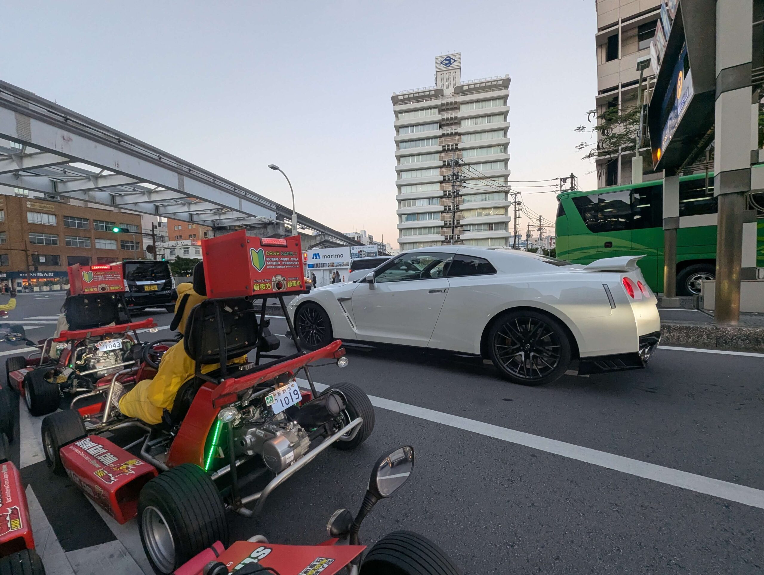 綠燈亮起,我們踩著油門,將車型排成一直列,一台跟著一台跟在教練後面,行駛在我們全然不熟悉的沖繩,貼地飛行。轉彎時我們打著方向燈,腳踩煞車控制力道,依序俐落過彎。停車時,路旁都是比我們還高出許多的小客車、大貨車,在沖繩市區開卡丁車上路的體驗,真的很特別。