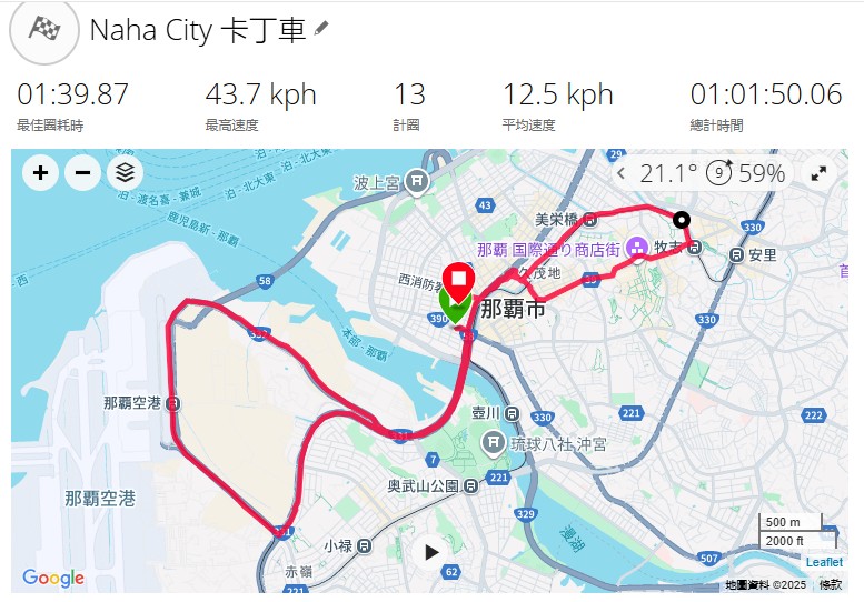 而事後根據GPS紀錄,我們行駛的路線主要是出發後行駛至那霸機場周邊,再繞行至國際通,最後回到車庫。實際開車時間為1小時,前置的換裝、看教學影片、聽簡報等都不會算在卡丁車的體驗時間內,實實在在地讓大家開足1個小時喔!所以建議未來想去日本玩卡丁車的朋友,行程安排上,整體時間抓個1.5-2小時會比較充裕。